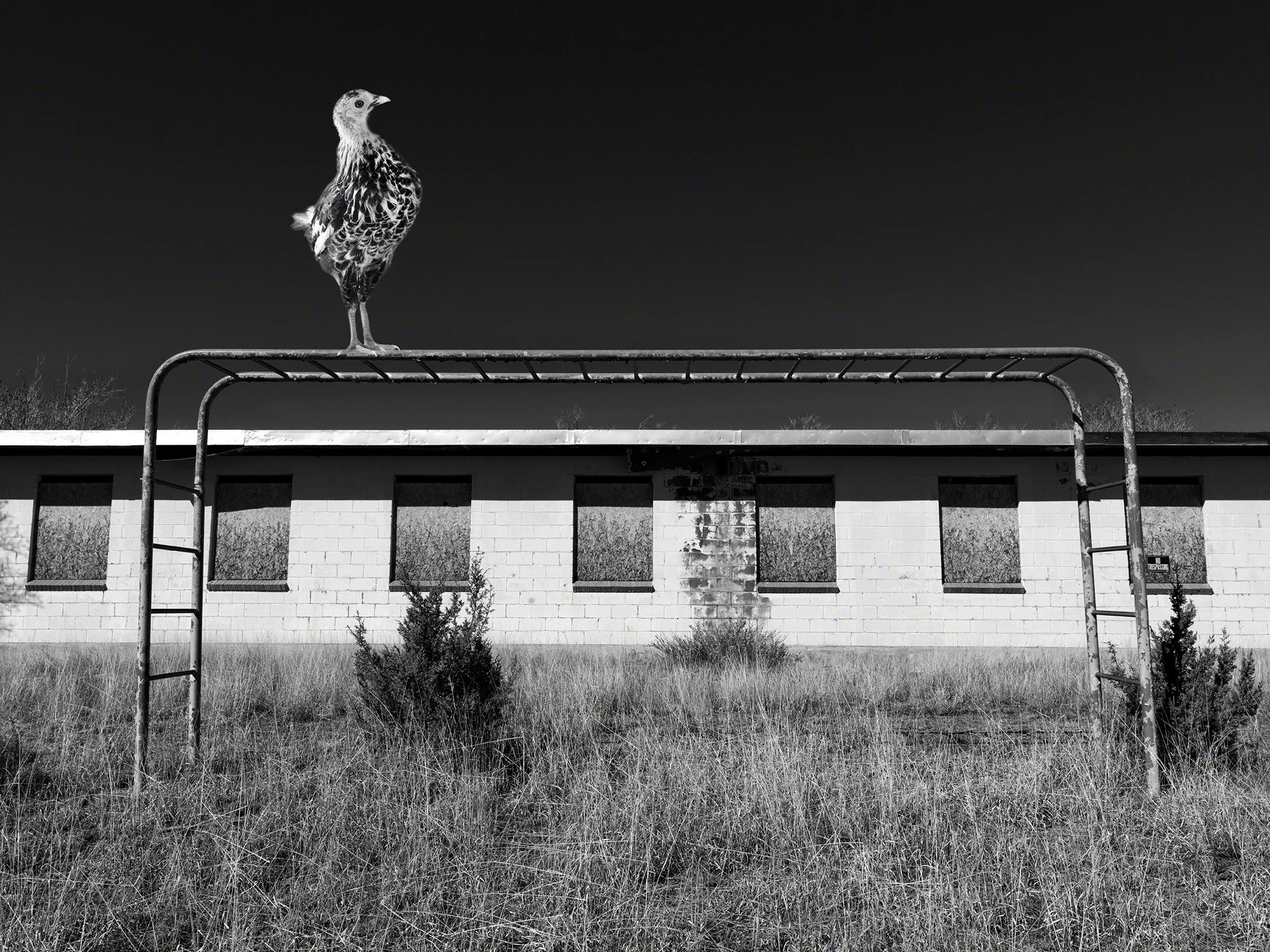 Composite black and white photograph:  Silver spangled Hamburg junior chicken + abandoned school  landscape